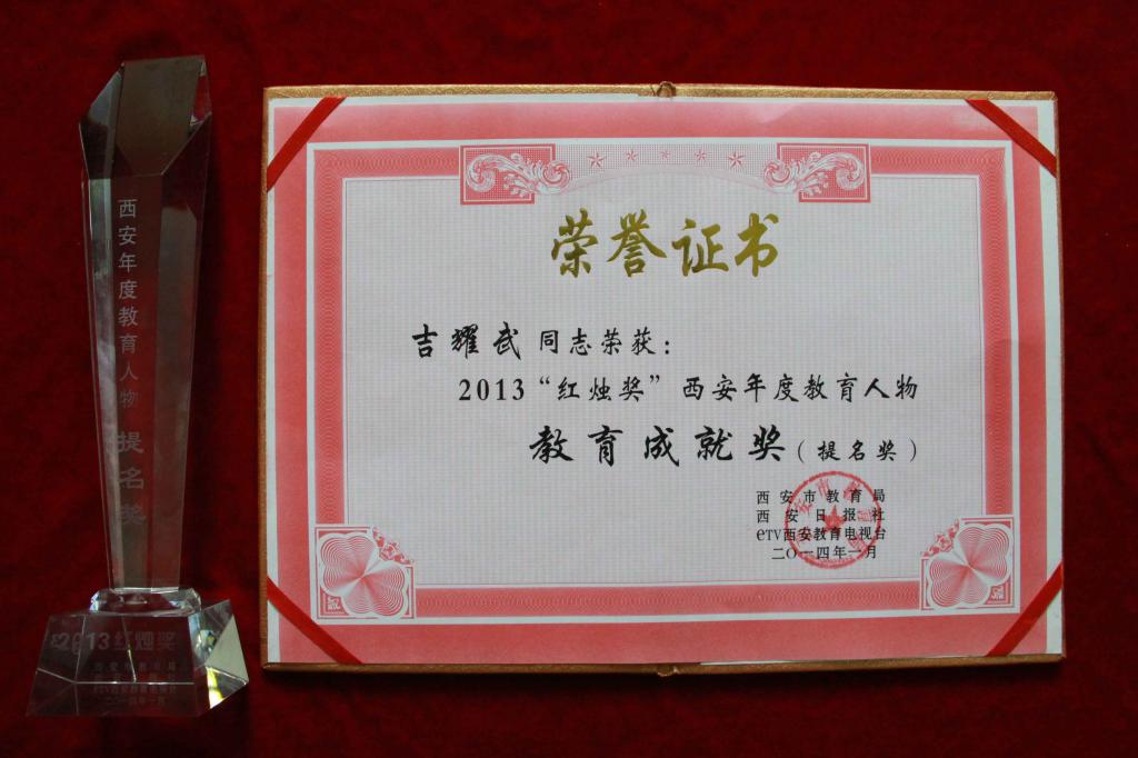 2013西安年度教育人物“红烛奖”是由西安市教育局、西安日报社、eTV西安教育电视台联合举办的全市优秀教育工作者评选活动,于2013年11月初启动。历经一个月的评比选拔,由各区县教育局、沣东新城教育局、各直属单位和社会各界推荐候选人127名。又经活动推选委员会评议,推选出36人作为年度教育人物候选人,在专家评委对36名候选人认真评审后,我院教师吉耀武同志以其真诚的工作热情,充足的工作干劲,永不停歇的进取精神,以及取得的各项骄人成绩,荣获成就提名奖。