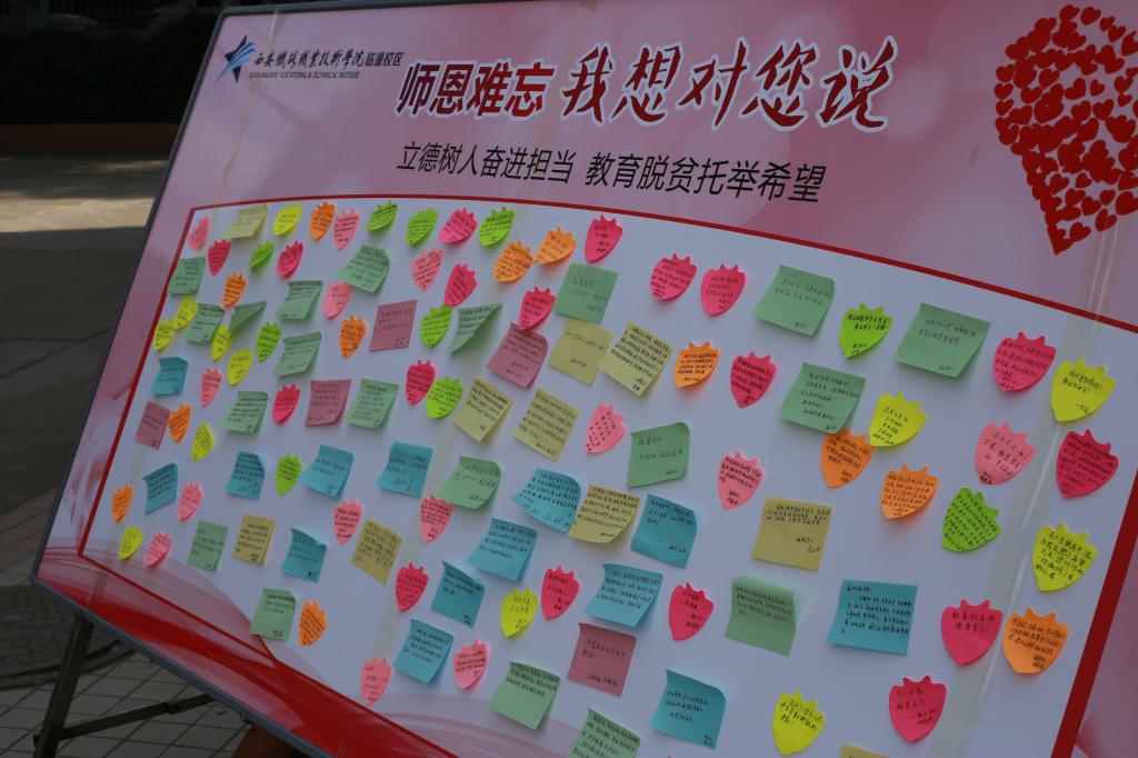 临潼校区的同学们开展了“师恩难忘,我想对您说”活动,同学们将自己对老师感谢与祝福的话语写在了便签上,表达了对老师们的感恩之情。自强校区的同学们为老师们送上鲜花与贺卡,向老师的辛勤付出表示感谢。同时,学院各个团支部开展了“感谢师恩”主题团日活动,同学们通过上台演讲,表达了对老师的感谢感恩之情。