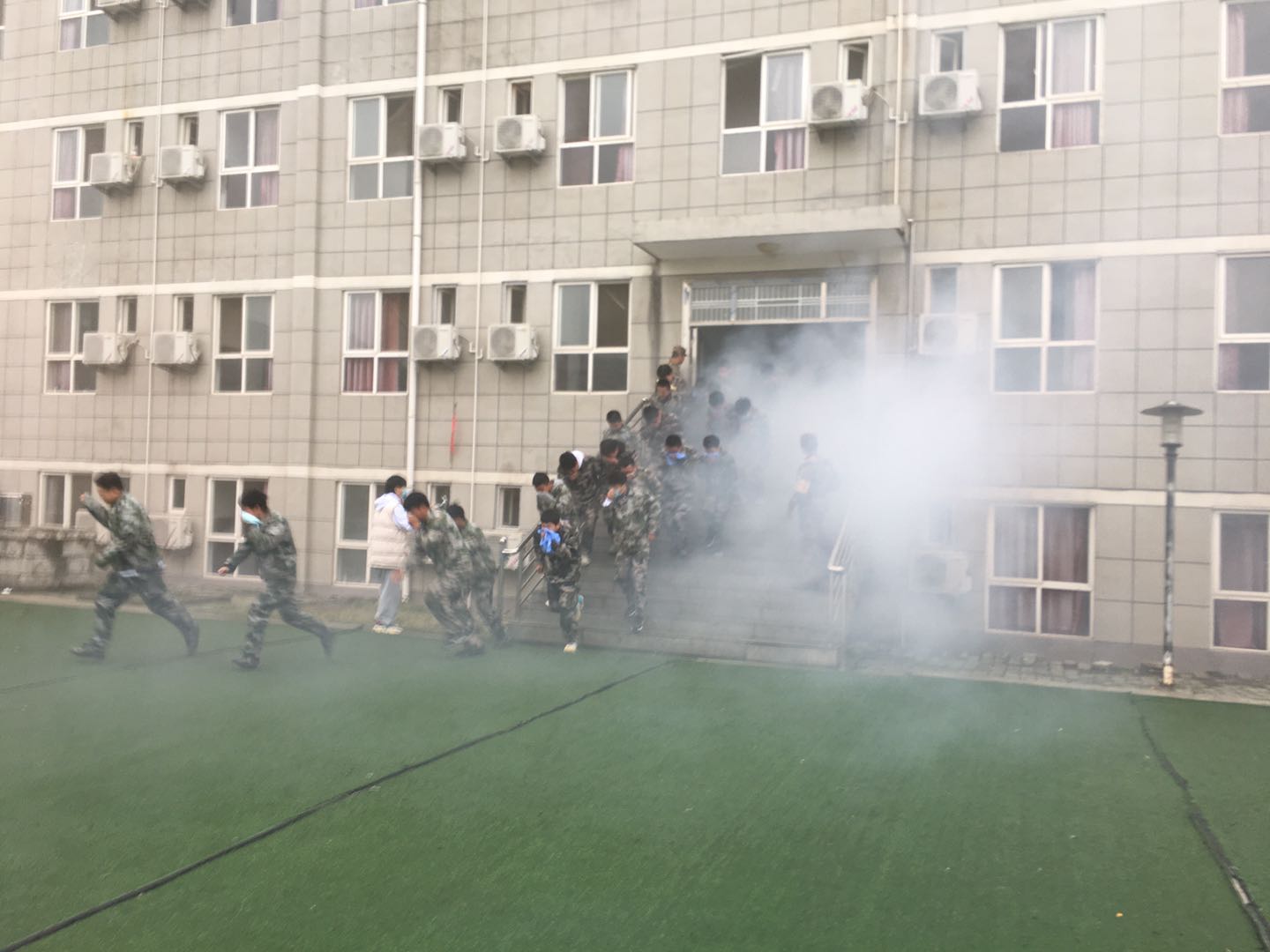 进入紧急安全疏散演练环节,教官拉响火警警报、释放烟雾装置,参演新生从“发生火灾”楼宇里迅速、有序逃离,正确使用湿毛巾捂口鼻、弯腰姿势逃离“火场”,同时报火警119,“消防队”赶来进行灭火与医务救援。