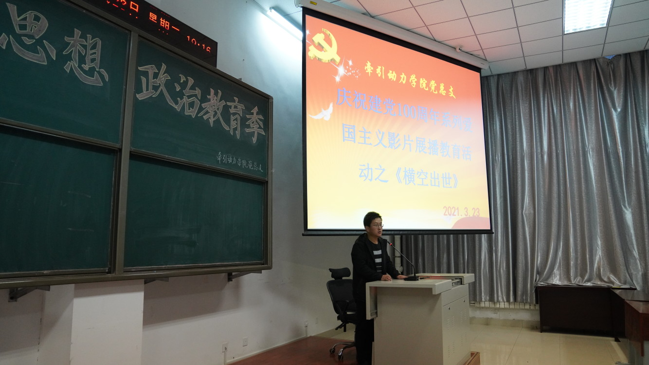 为庆祝建党100周年,牵引动力学院党总支计划开展系列爱国主义影片展播教育活动,让全体学生在课余时间观影,并征集优秀观后感,使学生更加深刻地体会到我国今天所取得成就之不易,以进一步增强广大学生对党和国家的热爱,增强广大学生的时代使命和责任担当意识,3月23日,牵引动力学院党总支面向全体学生,播放爱国主义影片《横空出世》。