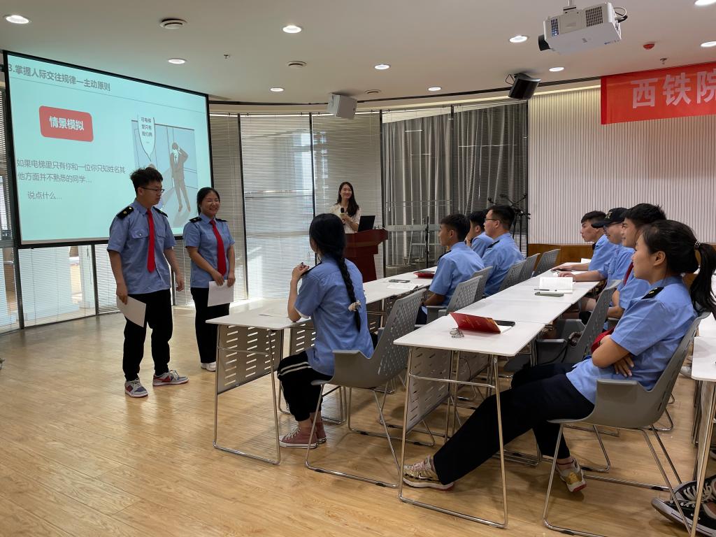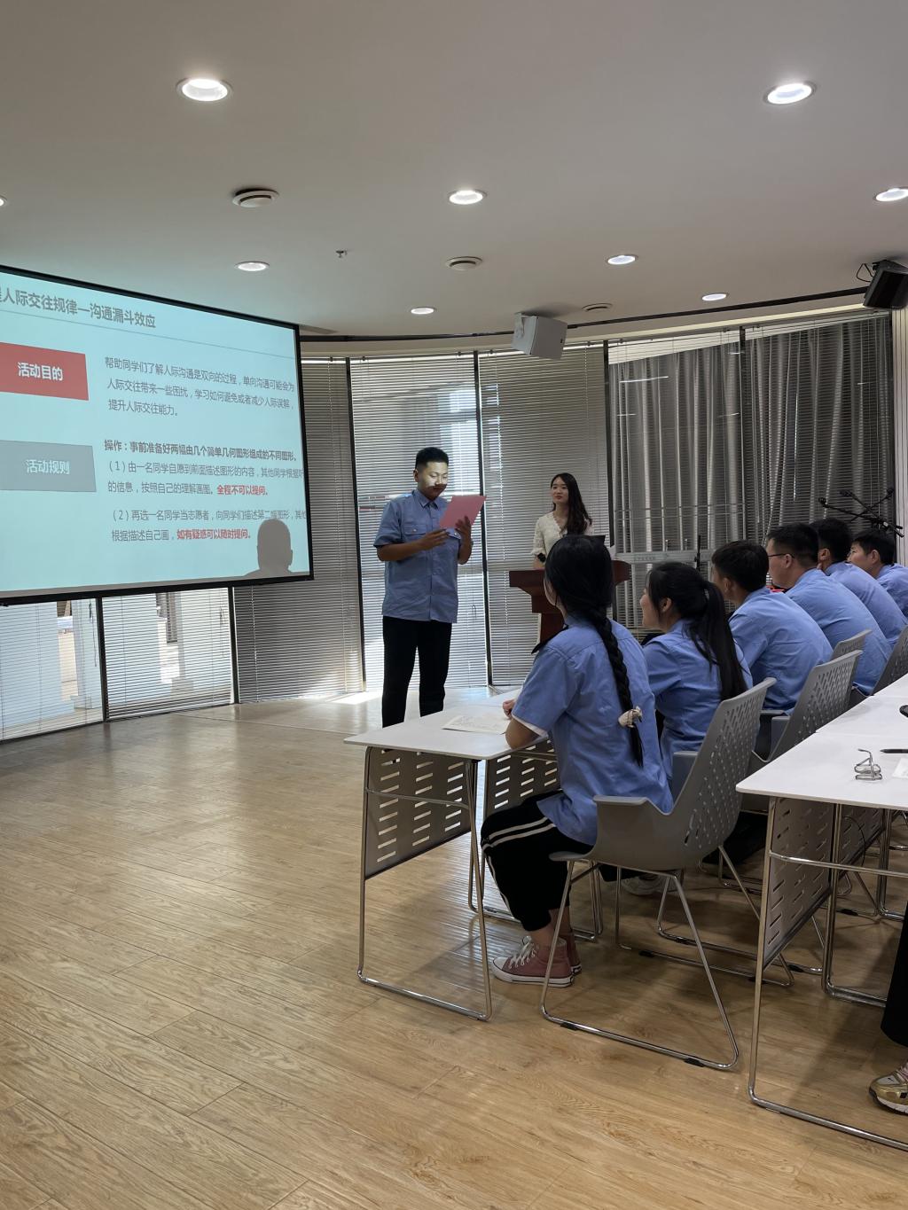 随后,重点分享了人际交往的三大规律。心理活动“两次绘画几何图形”,通过两次是否正确描绘出几何图形的对比讨论,向大家讲述了“沟通漏斗效应”,使学员认识到双向沟通的重要性;通过两次模拟电梯相遇情景,在实践对比中加深学员对交往“主动”原则的认识;以案例“红短袖+紫裤子+黄皮鞋”的穿着搭配,启发学员总结出负面意见表达的公式“肯定值得肯定部分——说出真实想法——提出建议”,并正确运用。
