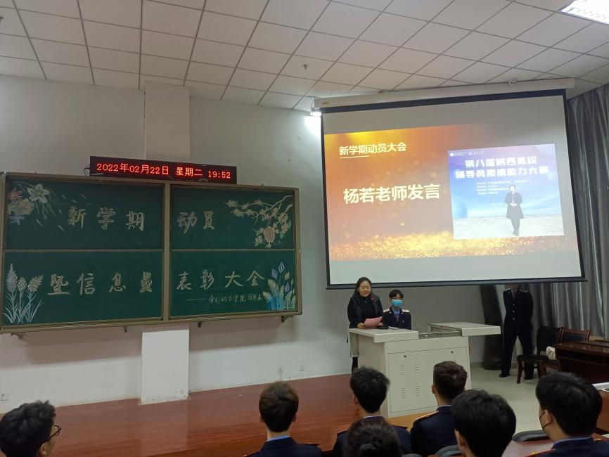 经历了上学期的风风雨雨与酸甜苦辣,我们迎来了新的学期。杨若老师首先肯定并感谢各位同学上学期的辛勤付出和鼎力配合,使得各项工作有序开展,并取得了显著成绩。其次,感谢各班信息员、信息部同学积极投稿,上学期微信公众号共发布数百篇稿件,其中疫情期间助力学院公众号发布了50余篇牵引防疫日记。最后,勉励各位同学们在新学期做好人生规划,坚持学习自律、做到奋发有为,“凡是过往,皆是序章”,让我们从现在做起,从自己做起,不负春天、不负时代、不负韶华,敢于持梦、顽强追梦,创造学习和工作的更大成绩!