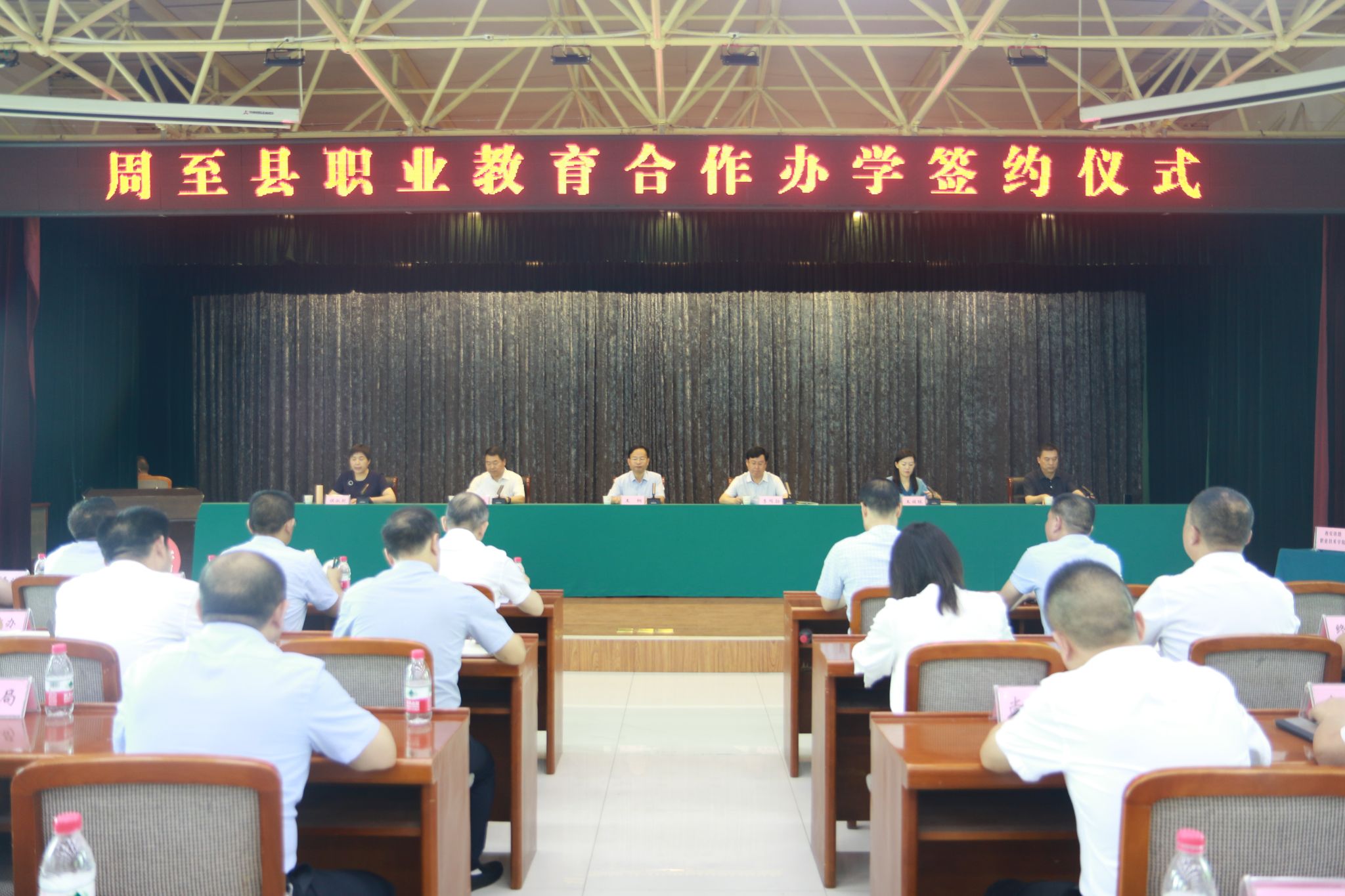 教务处处长腾勇代表学院与周至县教育科技局党委书记、局长任孝根签订《职业教育合作办学协议》,并为学院驻周至县翠峰镇新联村生源招录服务点授牌。