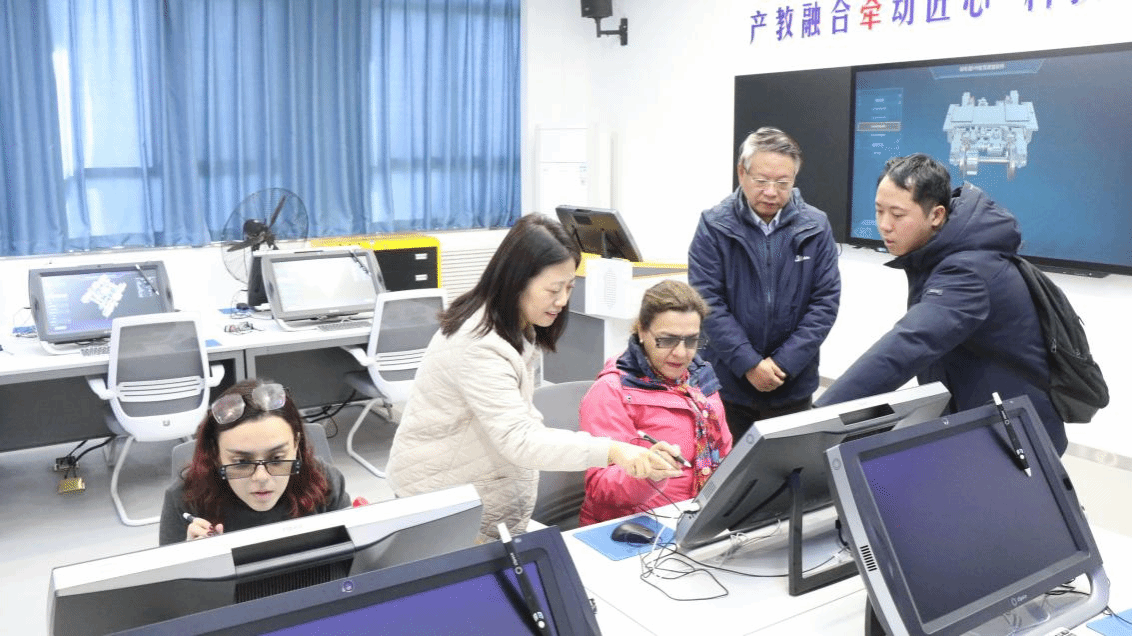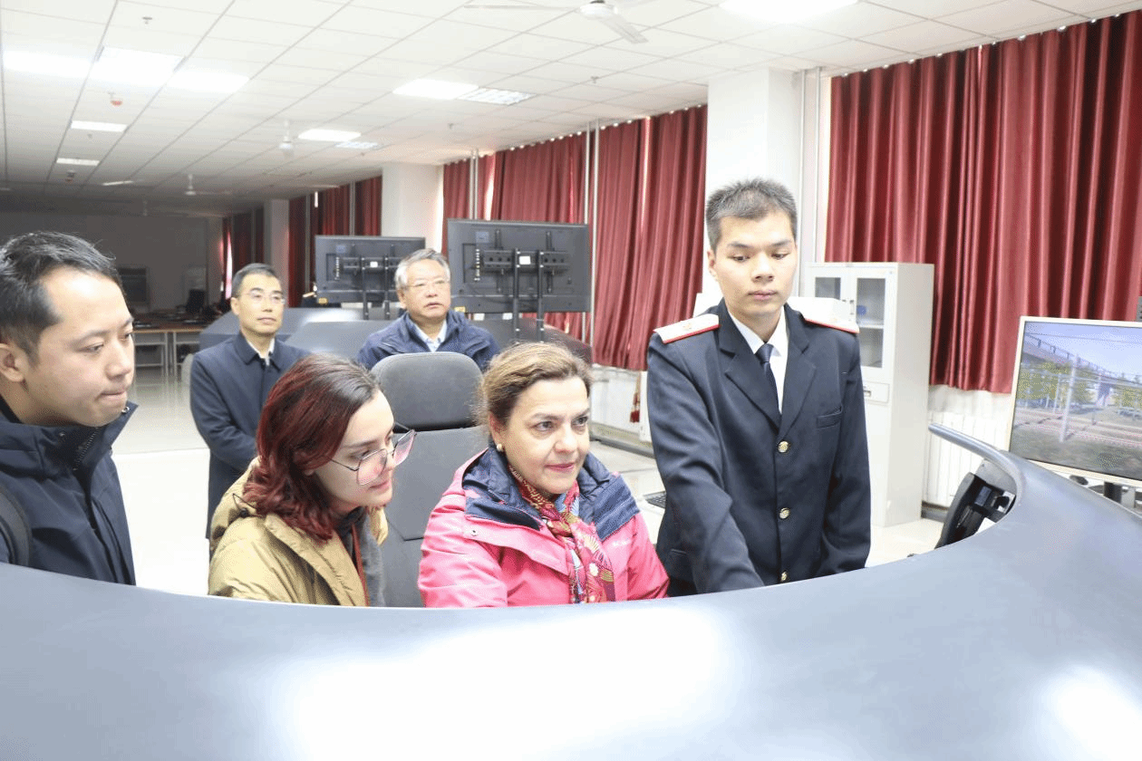 11月29日下午,在滕勇和国际合作处处长仵崇智陪同下,María 女士还参观了学校的校史馆和实训基地。在校史馆,María女士详细了解学校的历史沿革、专业设置、人才培养、国际化建设等方面的情况,与滕勇、仵崇智就学院办学理念、合作办学模式等情况进行交流。随后,Maria女士参观了牵引动力学院的实训室,牵引动力学院院长李益民向她介绍了学院的特色专业和国家级实训基地,李益民详细介绍了中国高铁的发展历程和前沿技术,并邀请María 女士亲自体验了高铁驾驶和虚拟仿真软件的使用。María 赞扬了学院雄厚的办学实力和优异的办学成绩,祝愿学院在新征程上取得更大成就。