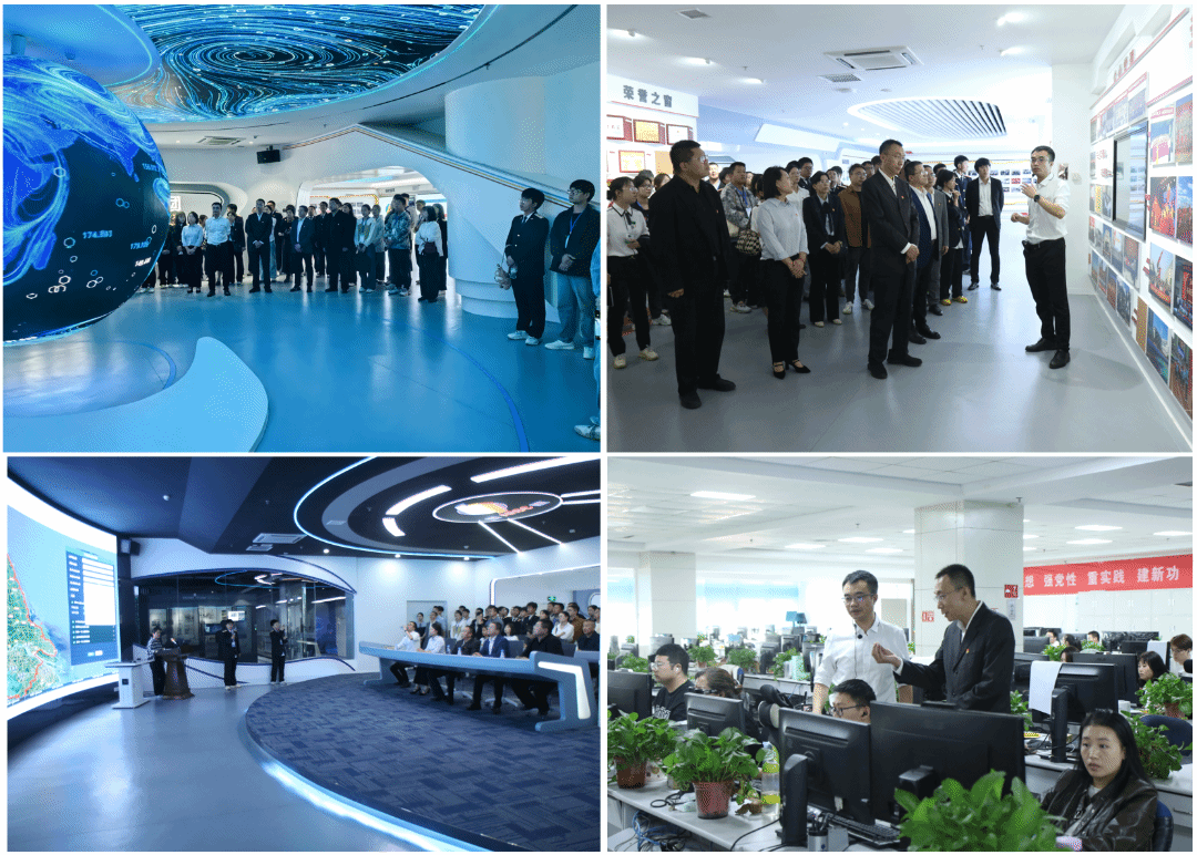 在马金龙的带领下,邓轩一行参观了中煤航测大数据中心展厅,了解了集团发展历史、重点项目、企业工匠事迹、党建成果、航测设备和技术产品及应用等,并实地观看“一带一路”卫星数据中心、生态环境修复监管、地质灾害监测预警等行业智慧化应用服务平台演示和航测生产现场。