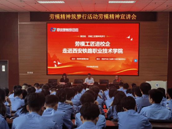 为进一步贯彻党的二十大精神,深入学习习近平总书记在全国劳动模范和先进工作者表彰大会上的讲话精神,落实立德树人根本任务,加强职业教育和职工教育,大力弘扬劳模精神、劳动精神和工匠精神,6月26日,由西安职教联合会主办、西安市总工会职工技术培训中心承办的2024年“劳模工匠精神筑梦行”劳模工匠进校企系列活动在贝博官网开展。贝博官网特邀中车西安车辆有限公司首席技能专家、劳动模范王勇军来校进行劳模事迹分享、现场技术指导以及交流座谈。参加此次活动的人员有ballBET贝博BB艾弗森副院长安学武、西安职教联合会秘书长石红艳、学院发展规划处副处长丁洪芬、机电工程学院院长代礼前、机电工程学院党总支书记张秀红、机电工程学院副院长郭峰,学院部分专业教师以及铁道车辆技术学生代表,共计200余人。此次活动由学院副院长安学武主持。