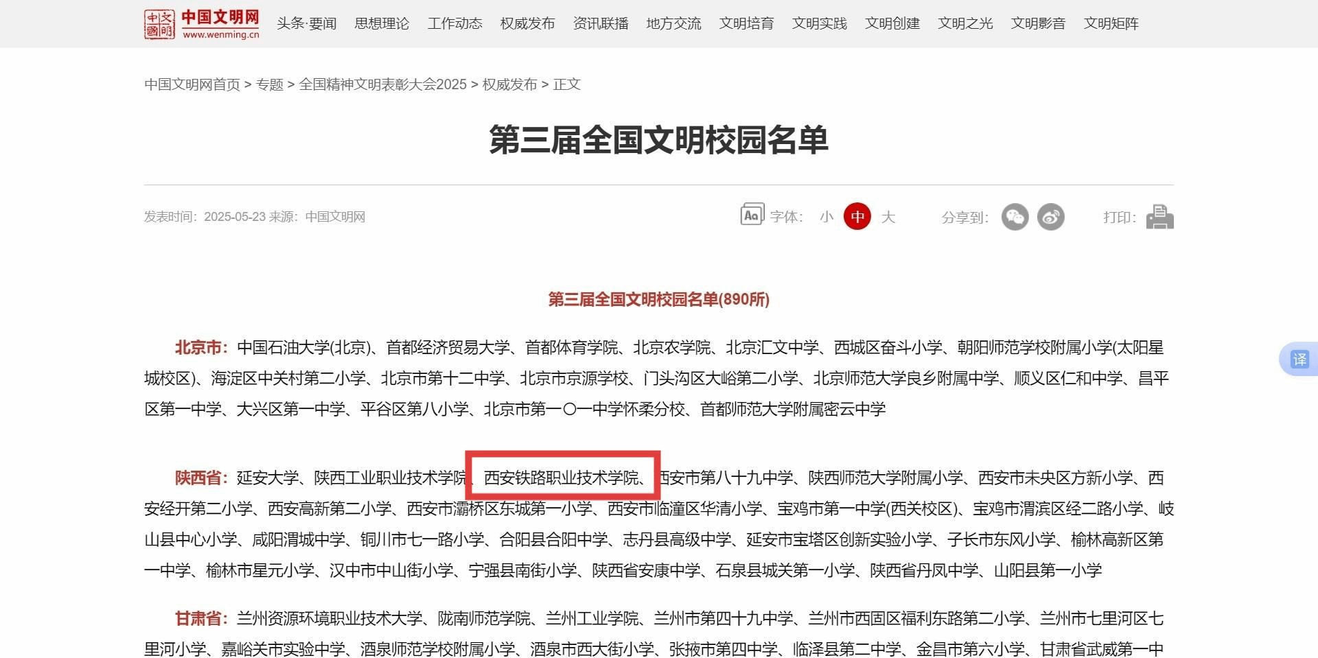 西铁院荣膺第三届“全国文明校园”荣誉称号
