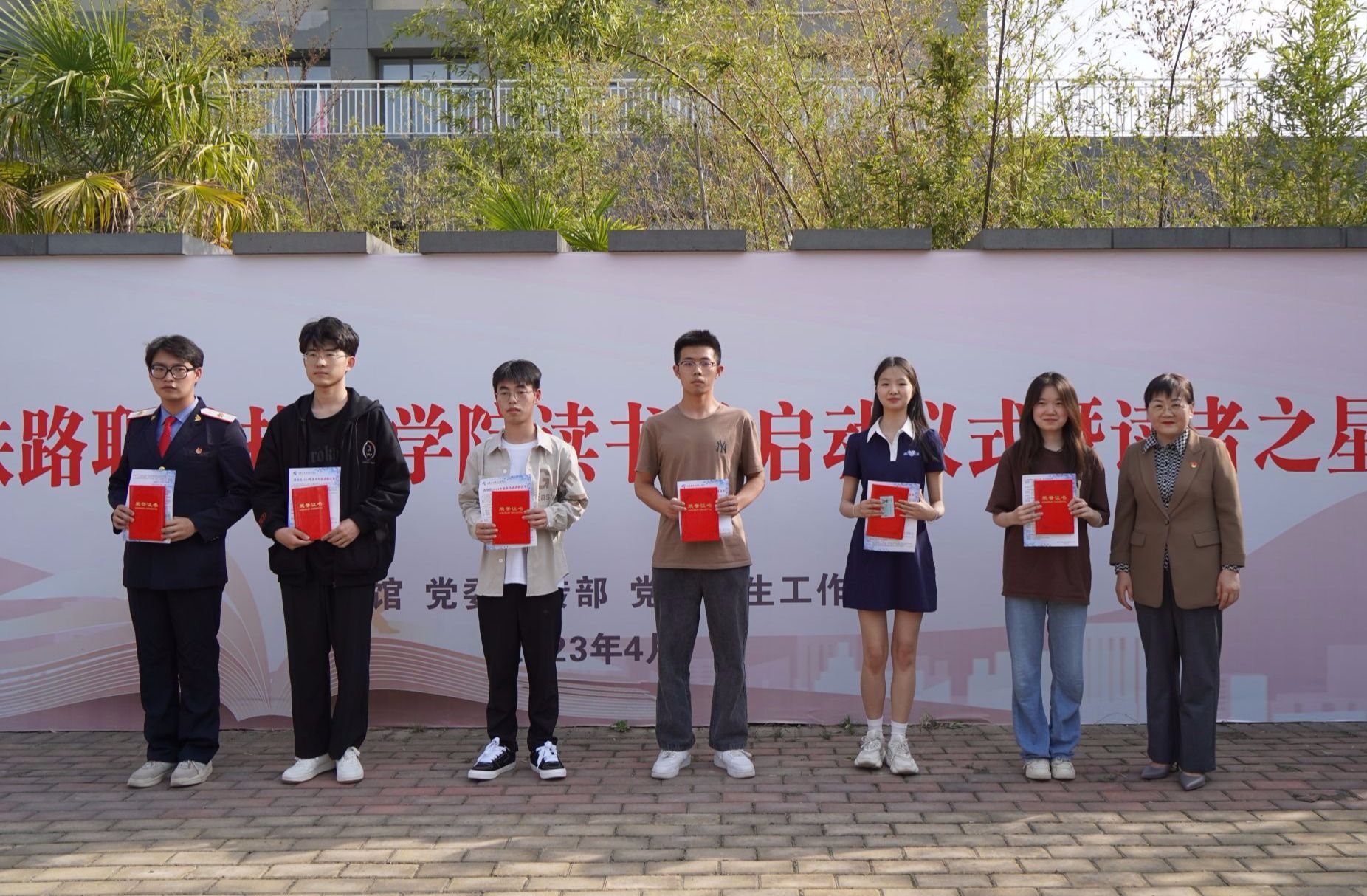 任治军为读者之星教师代表颁发证书,王琛、郭小莉、袁素瑛为读者之星学生代表颁发证书。