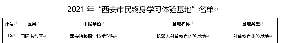 9月13日,西安市教育局办公室发布《西安市教育局办公室关于认定2021年“西安市民终身学习体验基地”的通知》(市教办发〔2021〕336号),贝博官网推荐的“机器人科普教育体验基地”被成功认定为2021年“西安市民终身学习体验基地”,该基地由电气工程学院承建,贝博官网将以此为契机,发挥示范引领作用,紧密围绕全民终身学习需求,深入发掘自身内涵特色,创新为民服务形式和载体,提高终身教育服务能力和水平。