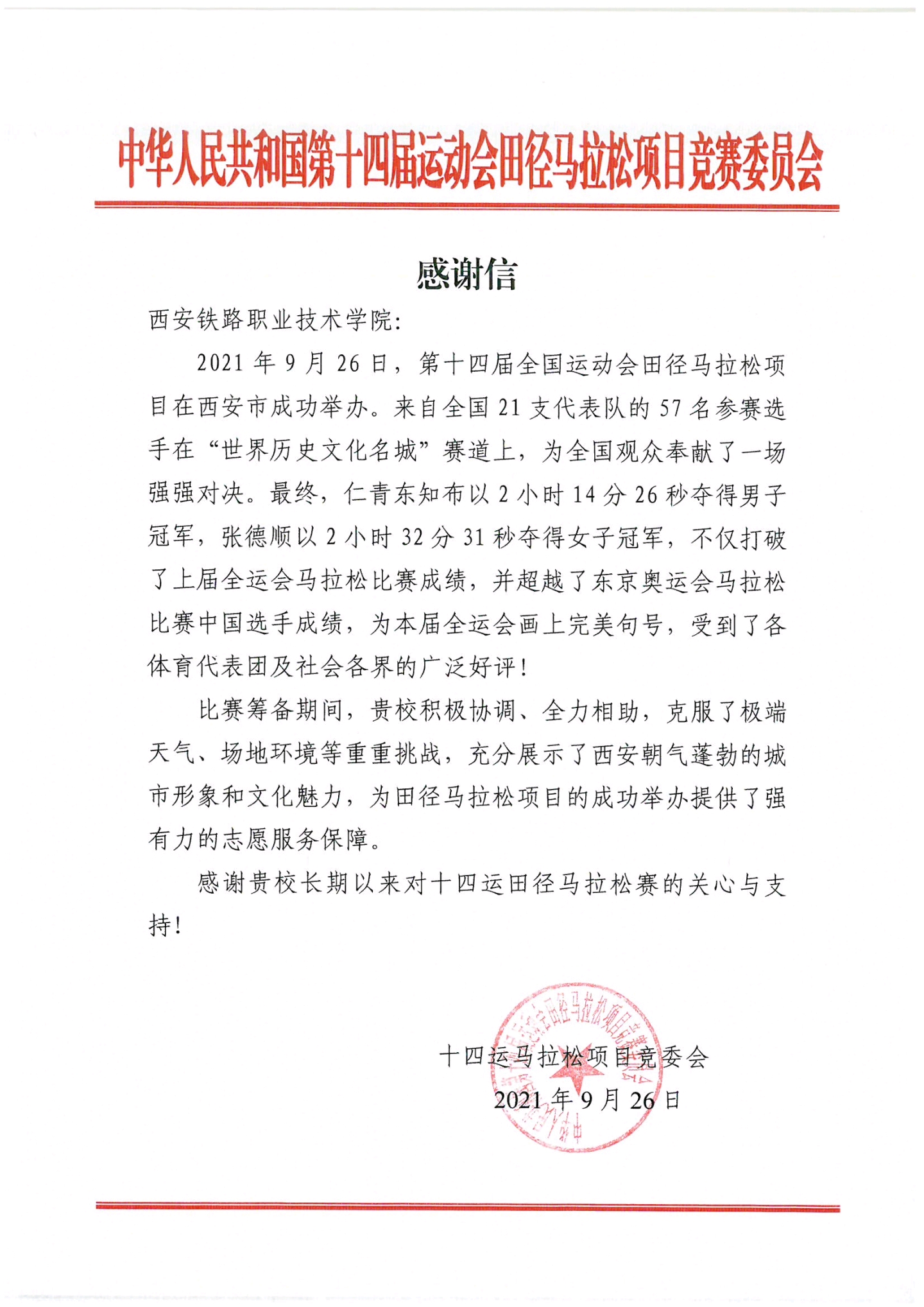 近日,贝博官网收到了第十四届全国运动会田径马拉松项目竞赛委员会发来的感谢信,信中对贝博官网积极配合十四运会的志愿服务工作表示诚挚的感谢。