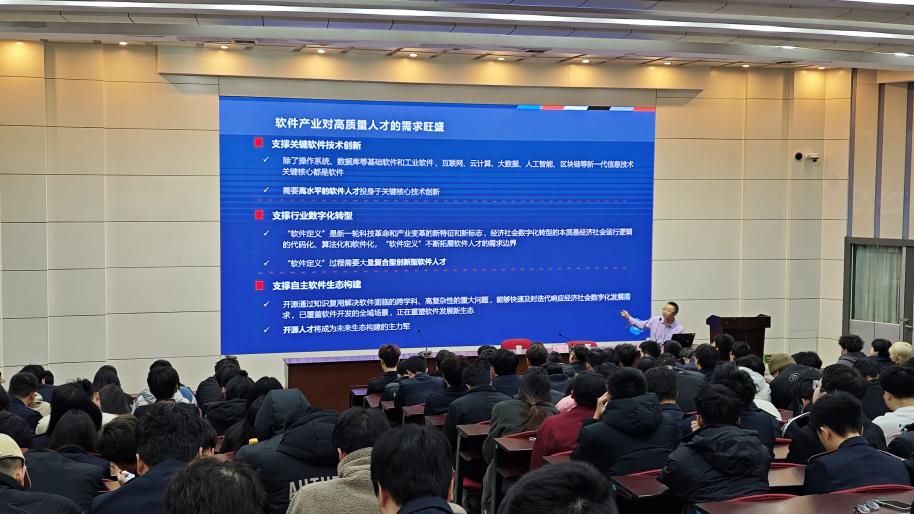 12月13日下午,电子信息学院特邀请行业领军企业——中软国际教育科技集团技术总监殷建军在自强校区阶梯教室为软件技术相关专业学生开展以“新时代软件技术人才需求与行业发展趋势”为主题的讲座。殷建军从当前人才现状分析就业岗位与发展、软件开发语言、项目及开发流程,从事软件相关岗位的职业发展通道和薪资待遇等四个方面进行详解。此次讲座让学生更清楚的了解到行业企业需求,对标人才培养方案查缺补漏,为自己未来的实习、择业、就业做好准备。学院将继续推进产教融合,深化校企合作,落实校企协同育人,为同学们提供更多更全面的前沿技术知识学习机会与就业资源,与企业共育高素质技术技能人才。