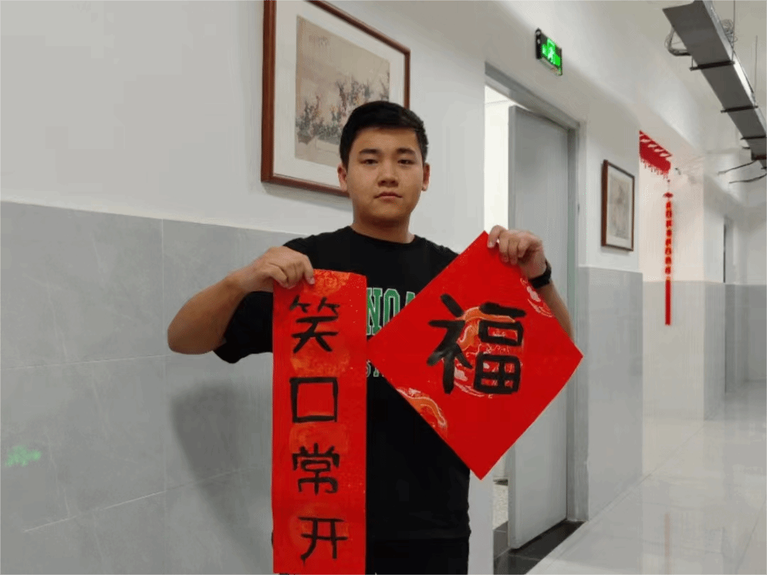 来自哈萨克斯坦的刘明涛同学拿着自己写的“福”和 “笑口常开”,说太激动了,一定要把写春联活动的感受分享给家人,也要把中国的新年祝福送给远方父母,告诉他们,在中国也能感受到家的温暖。