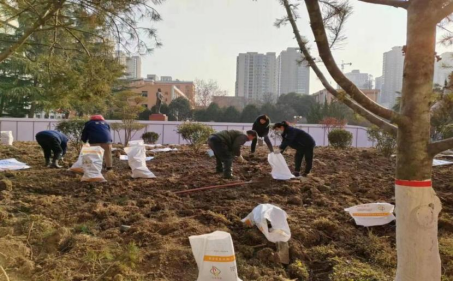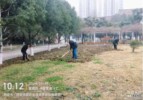 持续落实学院“三精”总要求,做校区师生服务保障的贴心人。人勤春来早,各岗位职工能目光坚定、手脚不停,持续深化、细化、完善校区服务保障工作。 1月13日—2月21日,历时近40天,总务科绿化、维修、水电、保洁等寒假全值职工能坚守岗位、做好值班巡查基础工作,配合园艺工作总体安排,抓紧假期、抢抓工期,对校区詹天佑广场草坪、办公楼北侧草木绿化区(6块草坪)近7亩,人力使用铁锨、铁耙等工具对其板结底土深挖翻新,清理底土杂物、杂草,为校区春季种植绿化草坪、美化校园做好准备工作。