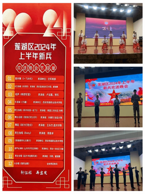 欢送仪式结束后,自强校区相关同志会同莲湖区武装部领导到省军区综合训练队礼堂观看了新兵欢送联欢晚会。受莲湖区武装部邀请,交通运输学院派出学生梁思佳、张欣宇担任新兵入伍欢送晚会主持人,并为晚会提供了手语操《万疆》和铁路服务礼仪展示的精彩演出,得到了在场观众一致好评。