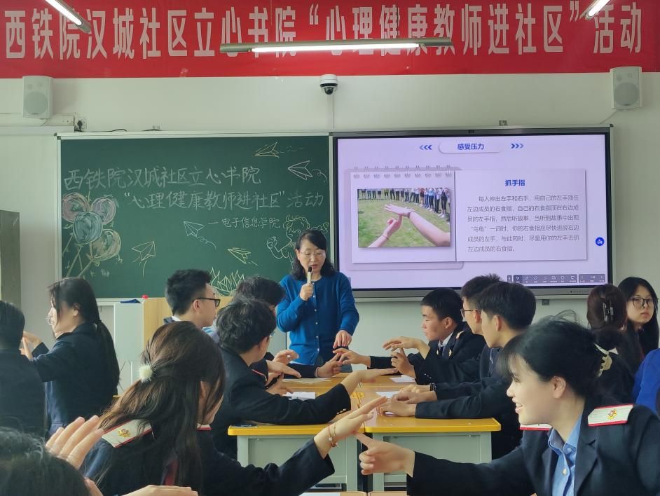 为进一步普及心里健康知识,提升心理健康育人水平,帮助同学释放情绪,缓解心理压力,引导学生关心自身悦纳自我,让同学们能够以乐观向上的态度去面对学习和生活,构建和谐美好的校园环境。4月10日下午,电子信息学院与马克思主义学院联合举办西铁院汉城社区立心书院“心理健康教师进社区”活动。本次活动由党委学生工作部主办,电子信息学院承办,马克思主义学院心理健康教师巴文娟担任主讲,电子信息学院心理健康工作辅导员胡士亮及各班心理委员40余名同学参与。