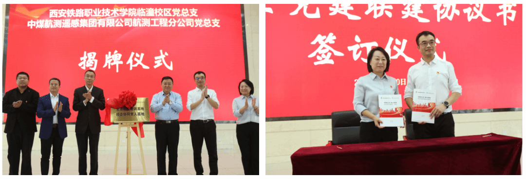 随后,临潼校区党总支与航测工程分公司党总支代表共同签署校企党总支联建协议,双方领导为“党员教育培训基地”“校企协同育人基地”揭牌。