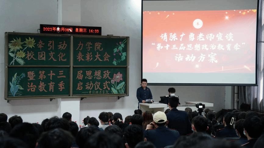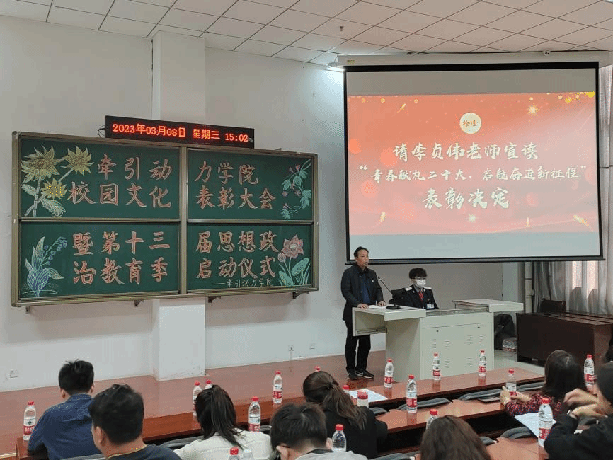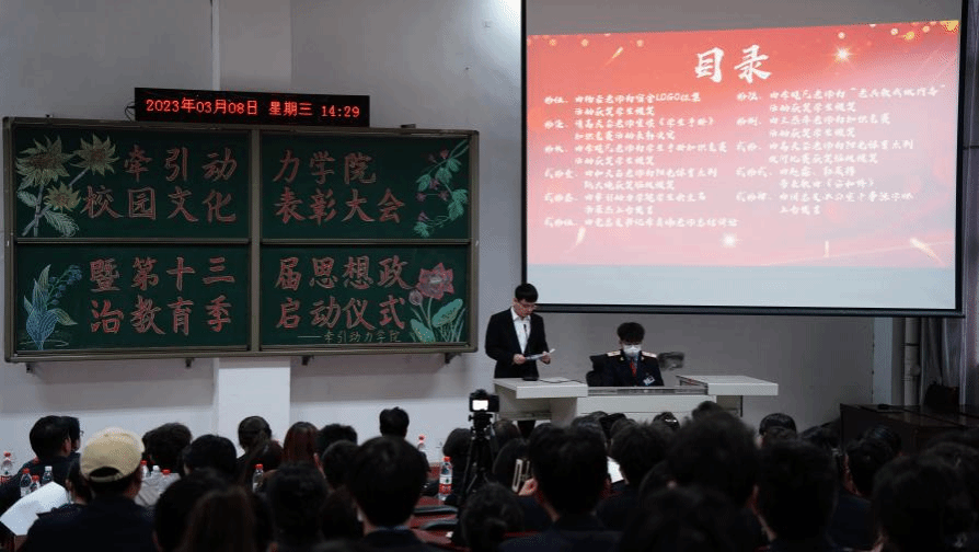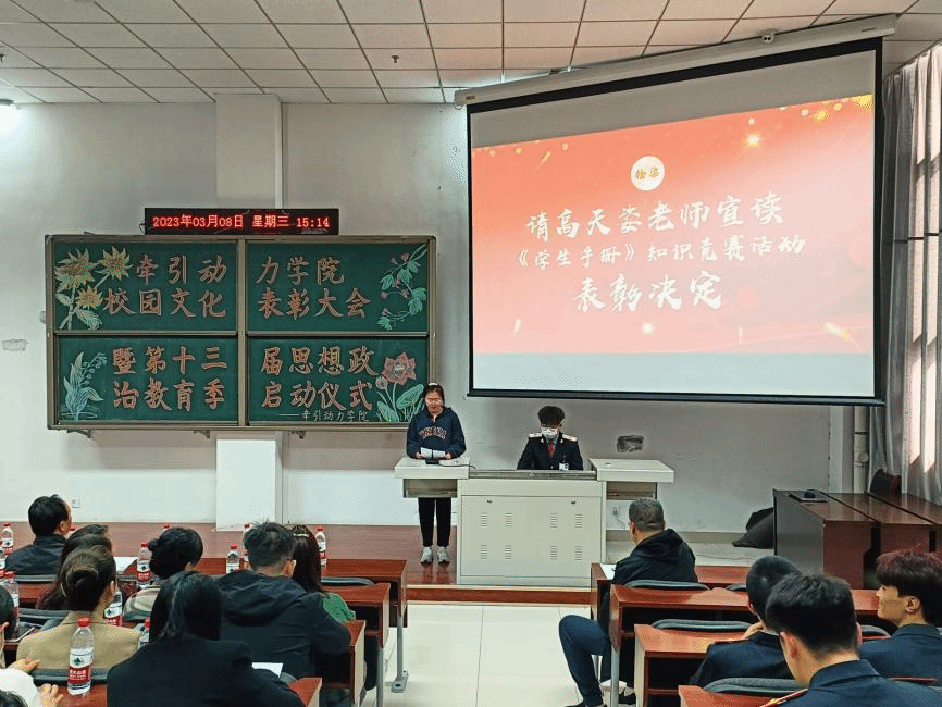 学习新思想,做好接班人,思想政治教育是历届高校素质教育的重要组成元素,为了能够有效的推进高校思想政治教育守正创新,3月8日牵引动力学院在105阶梯教室举办了“校园文化活动表彰大会暨第十三届思想政治教育季启动仪式”。总结回顾2022年学生思想政治教育工作,并对2023年重点工作进行安排部署。牵引动力学院党总支书记李贞伟、学工办主任陈广勇、组织委员王燕萍、各年级辅导员、班主任及学生代表约120余人参加会议,大会由辅导员牛鑫强主持。