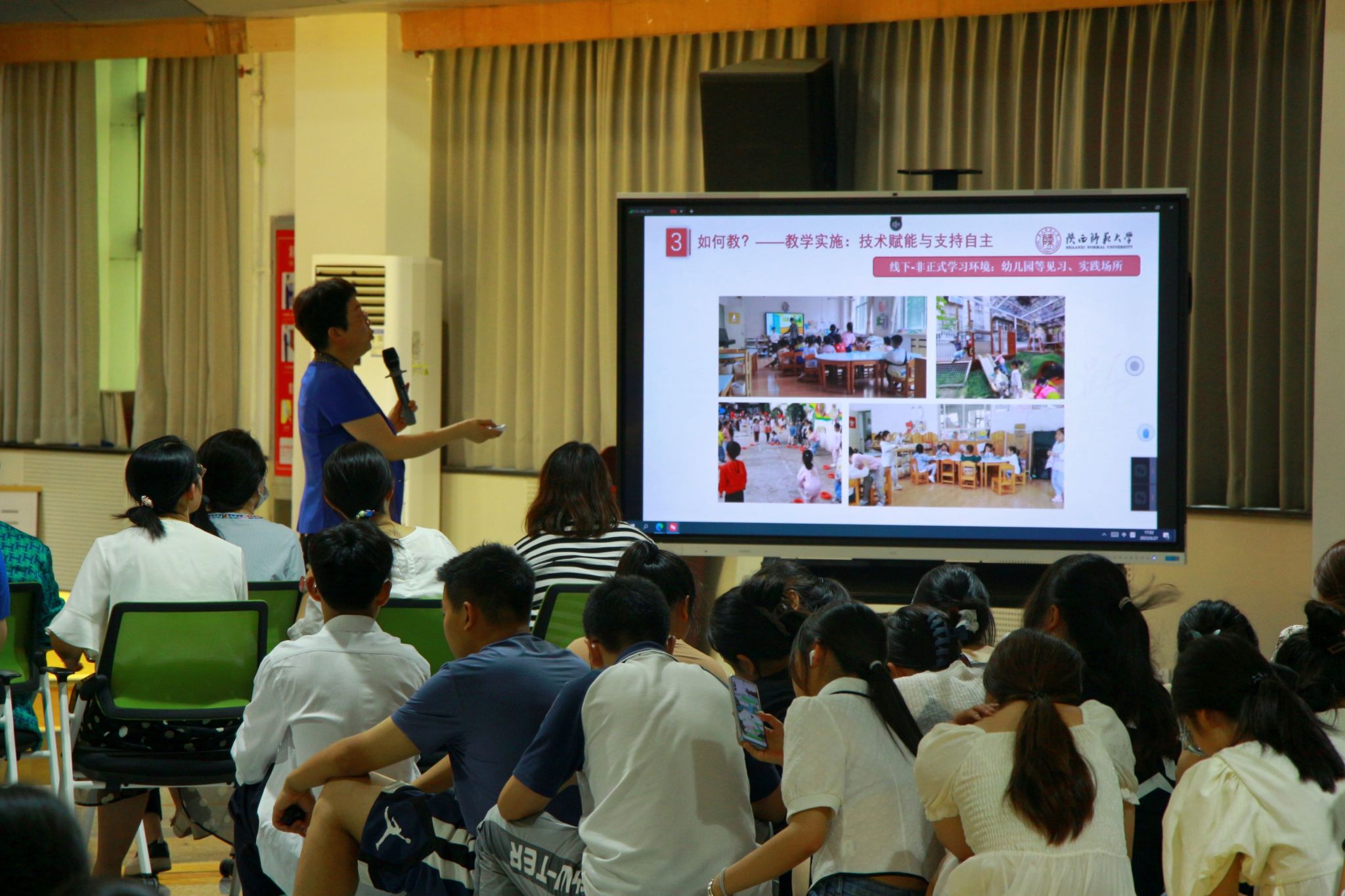 李少梅教授从一流课程建设的背景与理念、一流课程建设中的“教”与“学”、“教”与“学”互动下的实践探索三个方面向学前教育专业全体师生们阐述了当前高等教育教学改革中一流课程的建设意见和建议。在讲授过程中,李教授和学生还进行了多次互动,通过对幼儿诗歌的朗诵和分析,让师生们认识到了“教”“学”的辩证统一关系,以“学”定“教”,以“教”引“学”的理念,师生们受益匪浅。