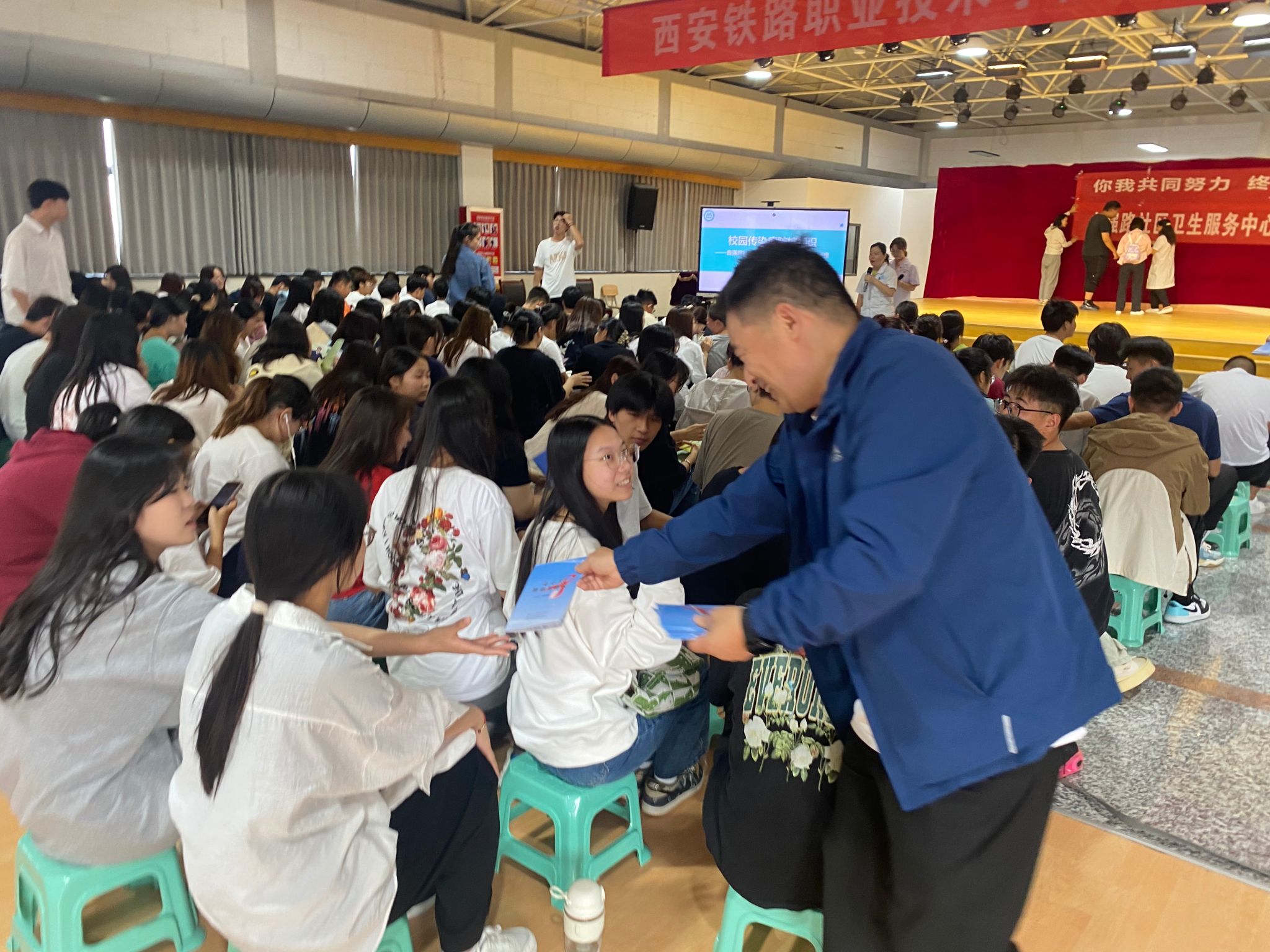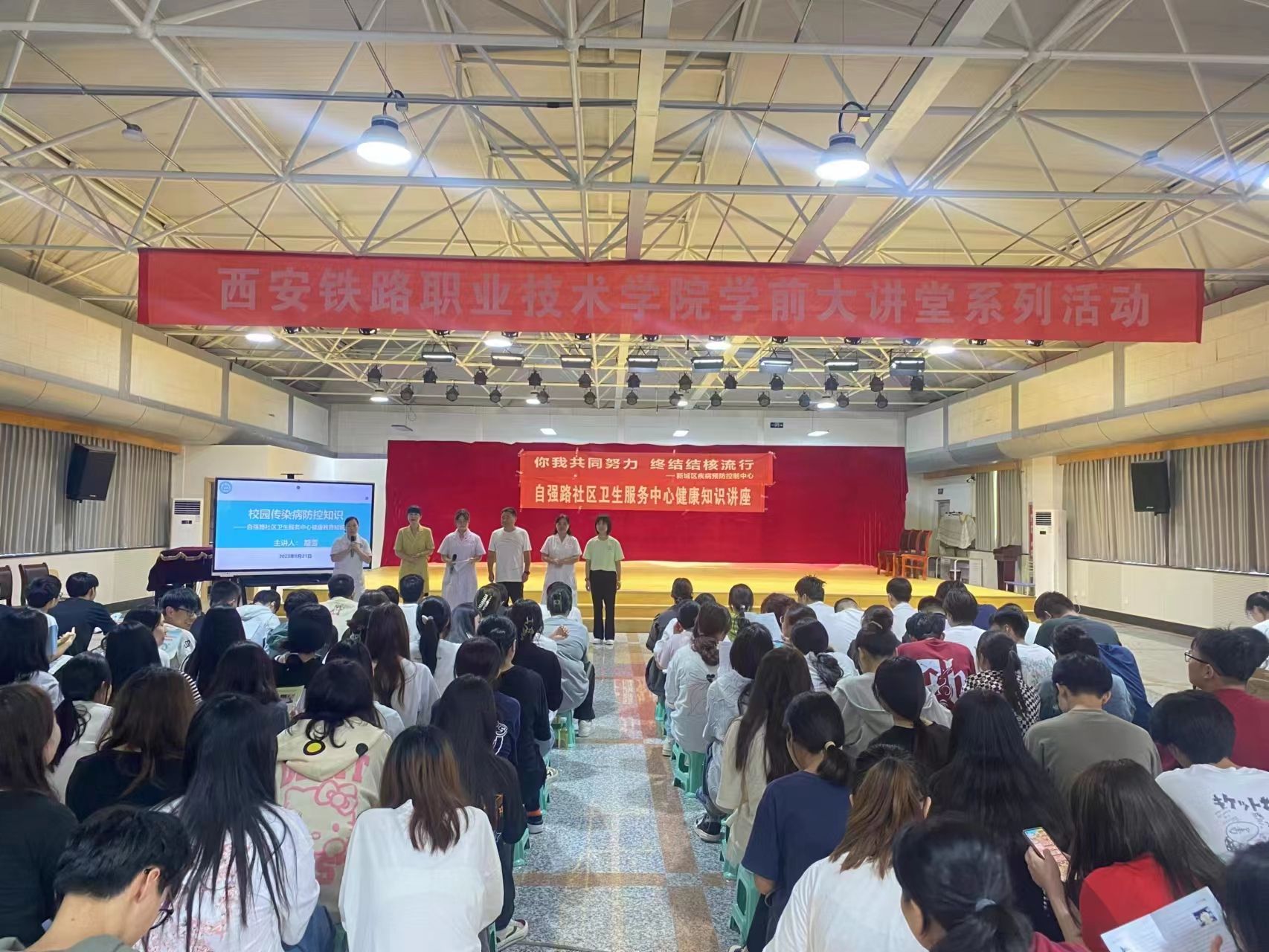 9月21日,自强综合管理处(龙首校区)、基础部学前教育专业联合新城区疾控中心,举办了2023年秋季学期学校传染病防控知识宣传活动。新城区疾控中心传染病控制副主任医师董晨阳、结核病防治专干刘凤芸,西安市第六医院公卫科健康教育专干魏艳再、传染病管理专干路雪、卫生监督协管李振宇出席活动,基础部学前教育专业2023级300余名新生参加了活动。路雪担任主旨宣讲。