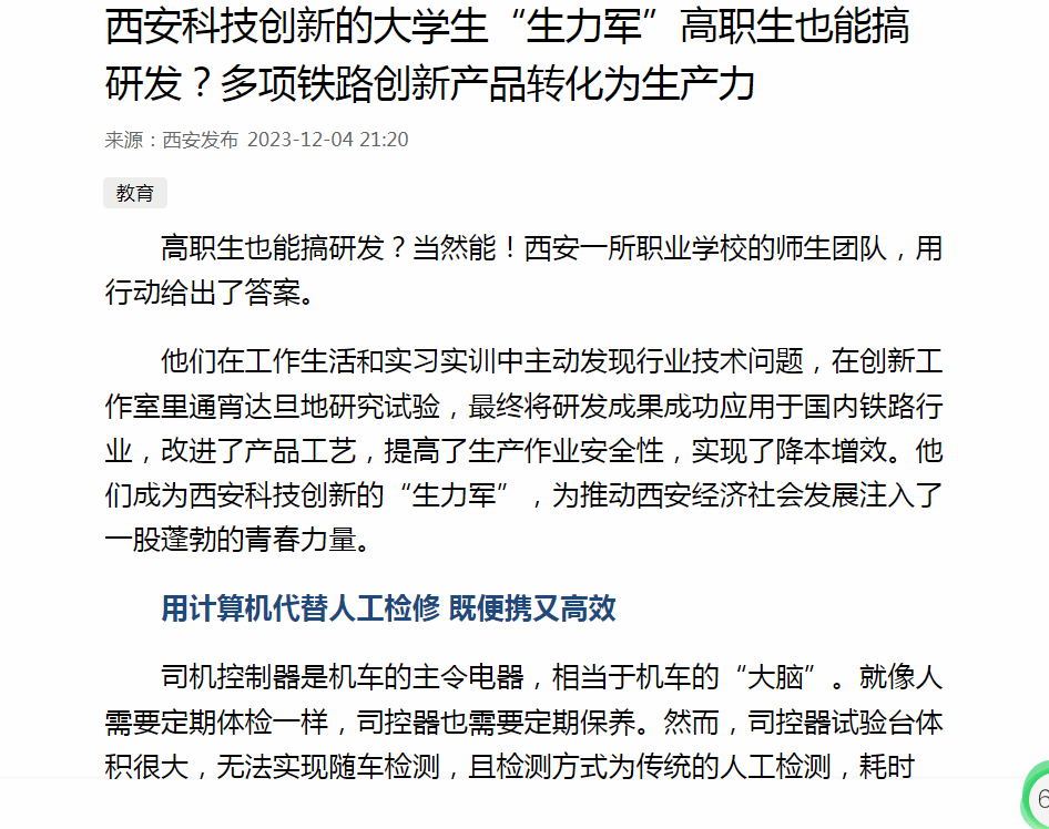 西安科技创新的大学生“生力军”高职生也能搞研发?多项铁路创新产品转化为生产力