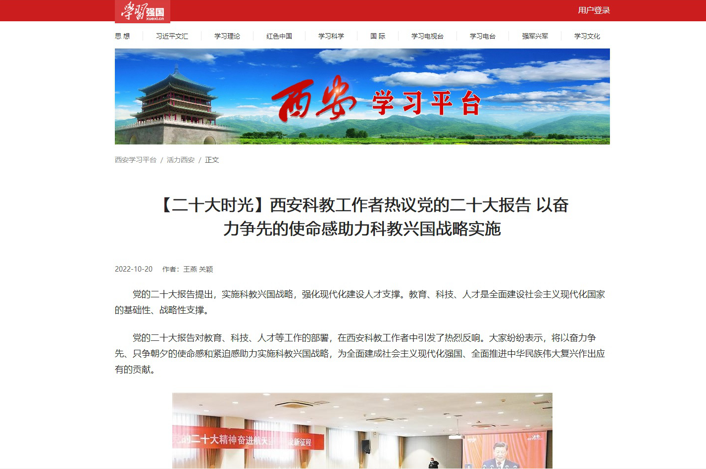 【二十大时光】西安科教工作者热议党的二十大报告 以奋力争先的使命感助力科教兴国战略实施https://sn.xuexi.cn/local/detail.html?ae5e411fe91d6d3c1ac4def110933f4f=d7617775890a82346831cbb77c8f9301&6e9d852f0075def5a5b44097c3ebecda=ff0523cd7e740733d07a527cee7d4b329e429bd3316c1f06cfe86422bb05e4de&ac11f3c9ee565cedc2b7aa9b8914e5a6=81e0083613e7ba24bb6391d5d5c94c79&21a43e4433405301a50eb5898cebfe4e=64a497523169694e870fdcf9a7d3423f